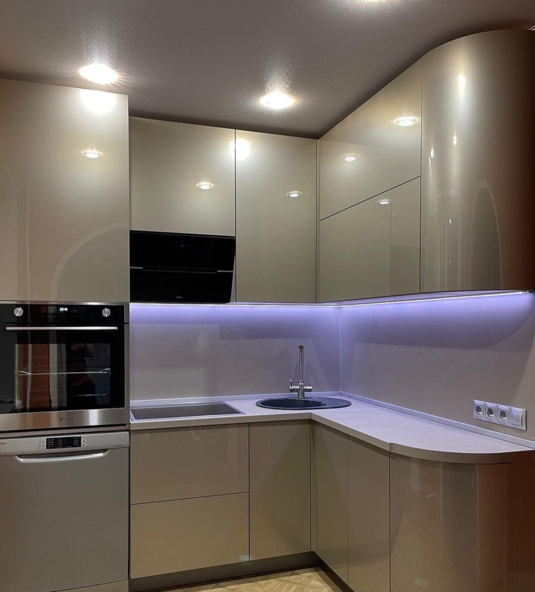 Не большая кухня с гнутыми фасадами и подсветкой