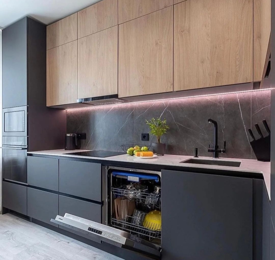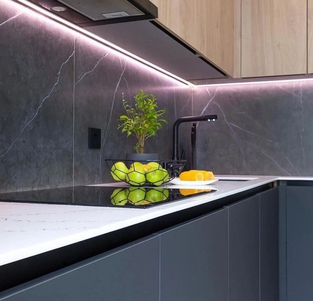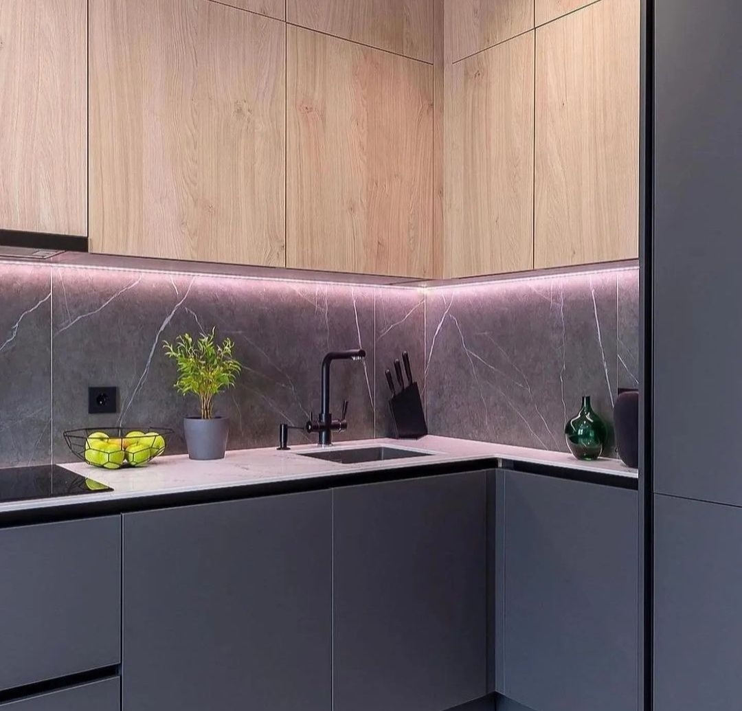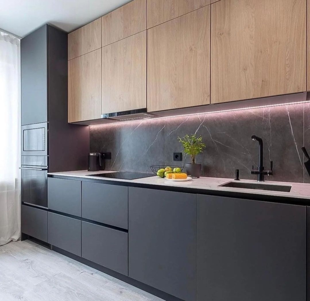 без ручек , с подсветкой, со встроенной техникой, со скинали